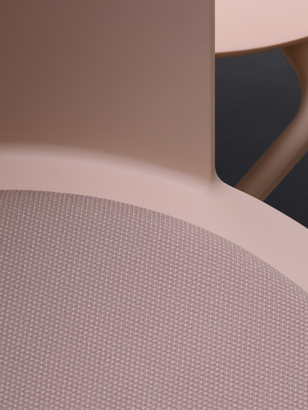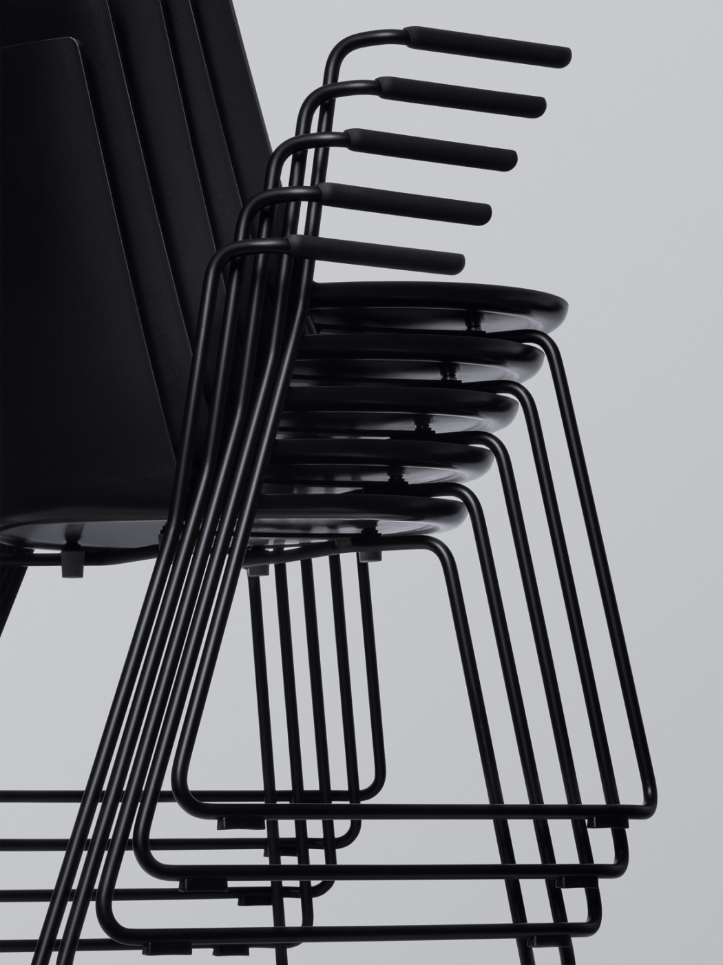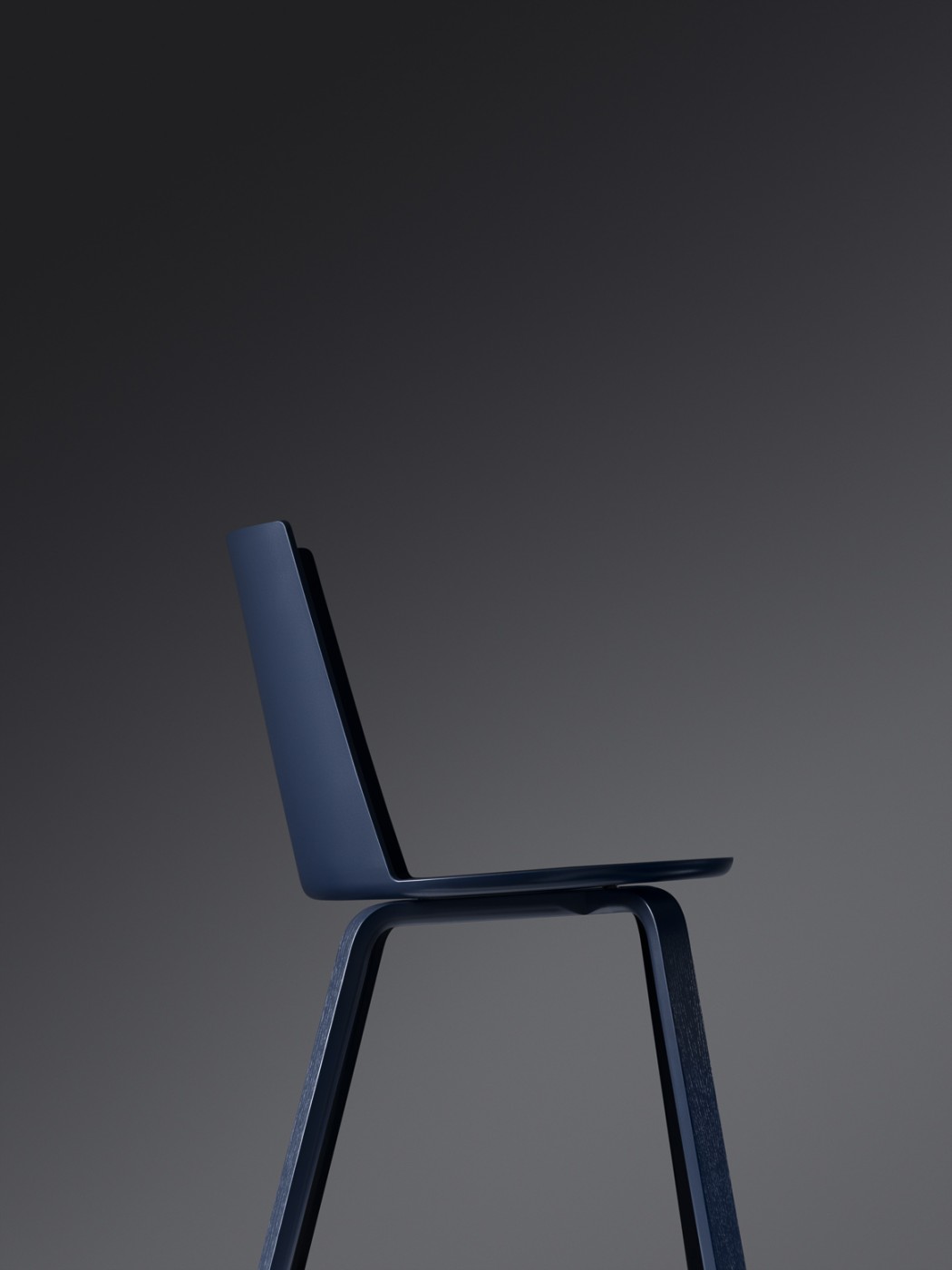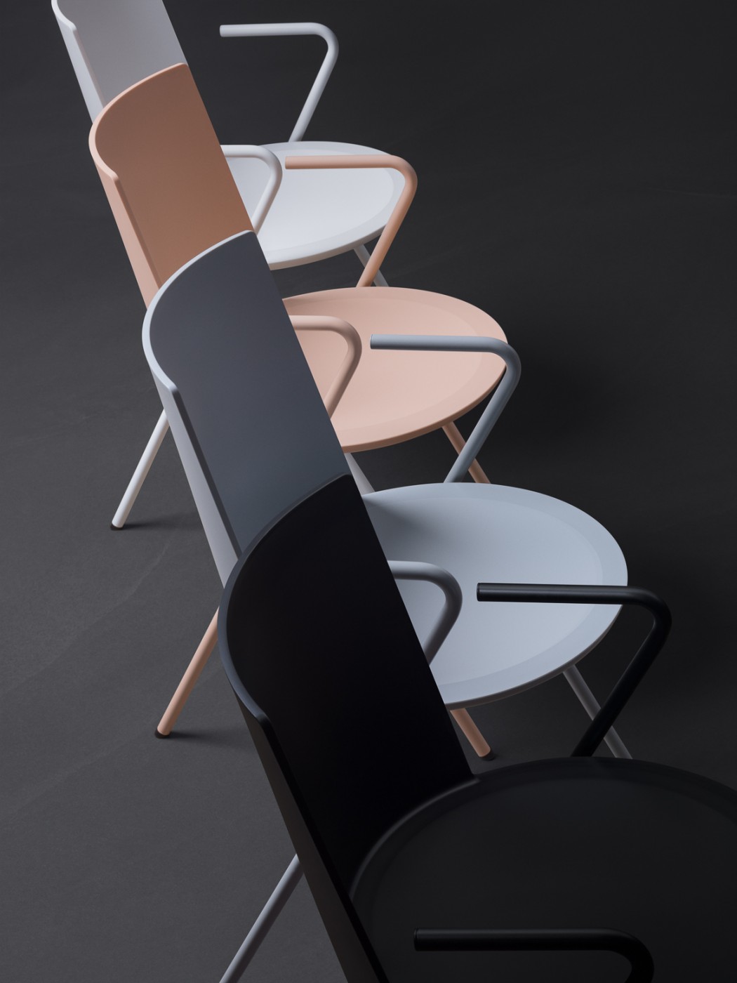 Acme is a bold, schematic design of a multi-purpose shell chair. The duo’s first articulation of a chair, it was originally exhibited at SaloneSatellite 2014. The contrasting geometric forms – circle and square – come together in a surprisingly compatible way, offering comfort while maintaining a minimalistic aesthetic. Unique leg designs complement the shell, giving each model a distinct character. The use of basic geometric shapes echoes the approach of Constructivist art, while the transitions and creases between surfaces recall ’90s electronic device design. The stackable Acme A-leg model highlights the integration of circle and square in the shell and the presence of a triangular shape in the legs.