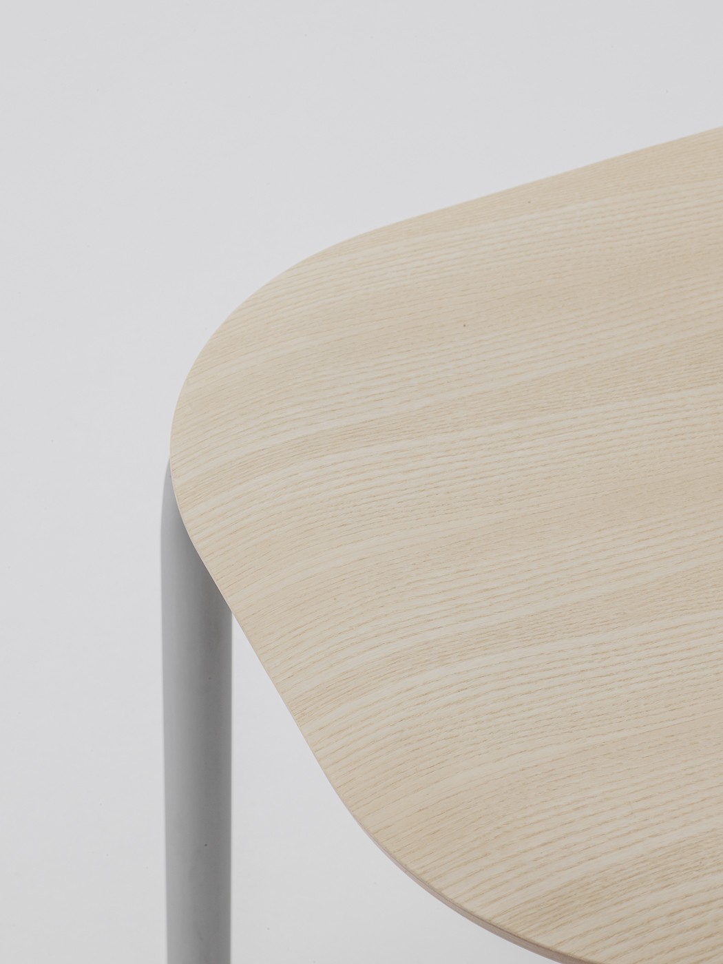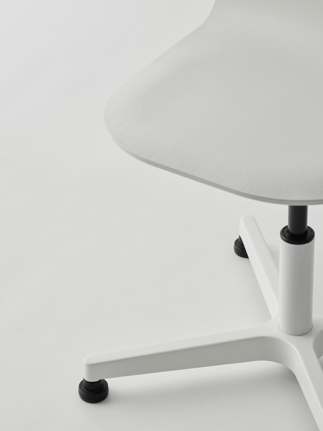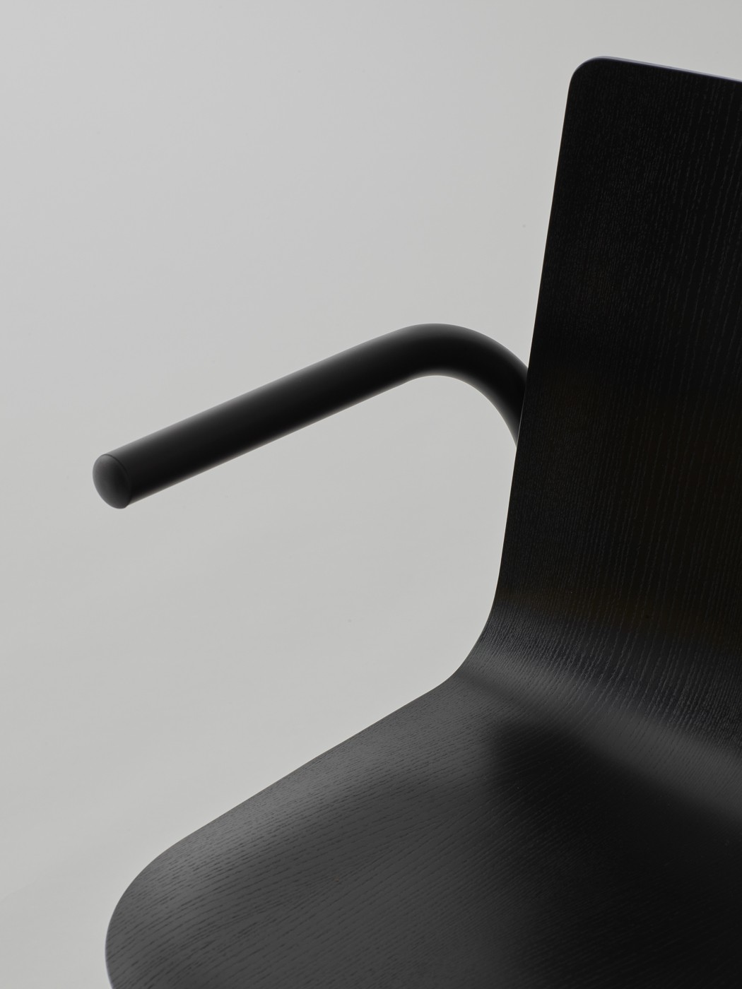 The Glyph chair system by Geckeler Michels features a moulded wooden shell that explores the 3D-shaping limits of common wood veneers. The seat’s soft, circumferential edge allows for a generous 180° range of motion, while the reduced material thickness in the back provides a pleasant spring effect. Glyph combines ergonomic seating with a minimalistic form, offering a wide range of configurations. The ash veneer shell is available in different colours and can be paired with various base frames.
