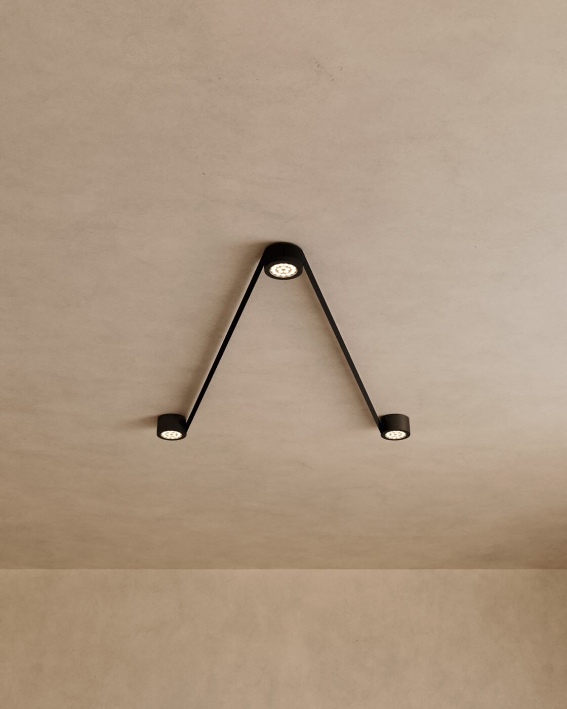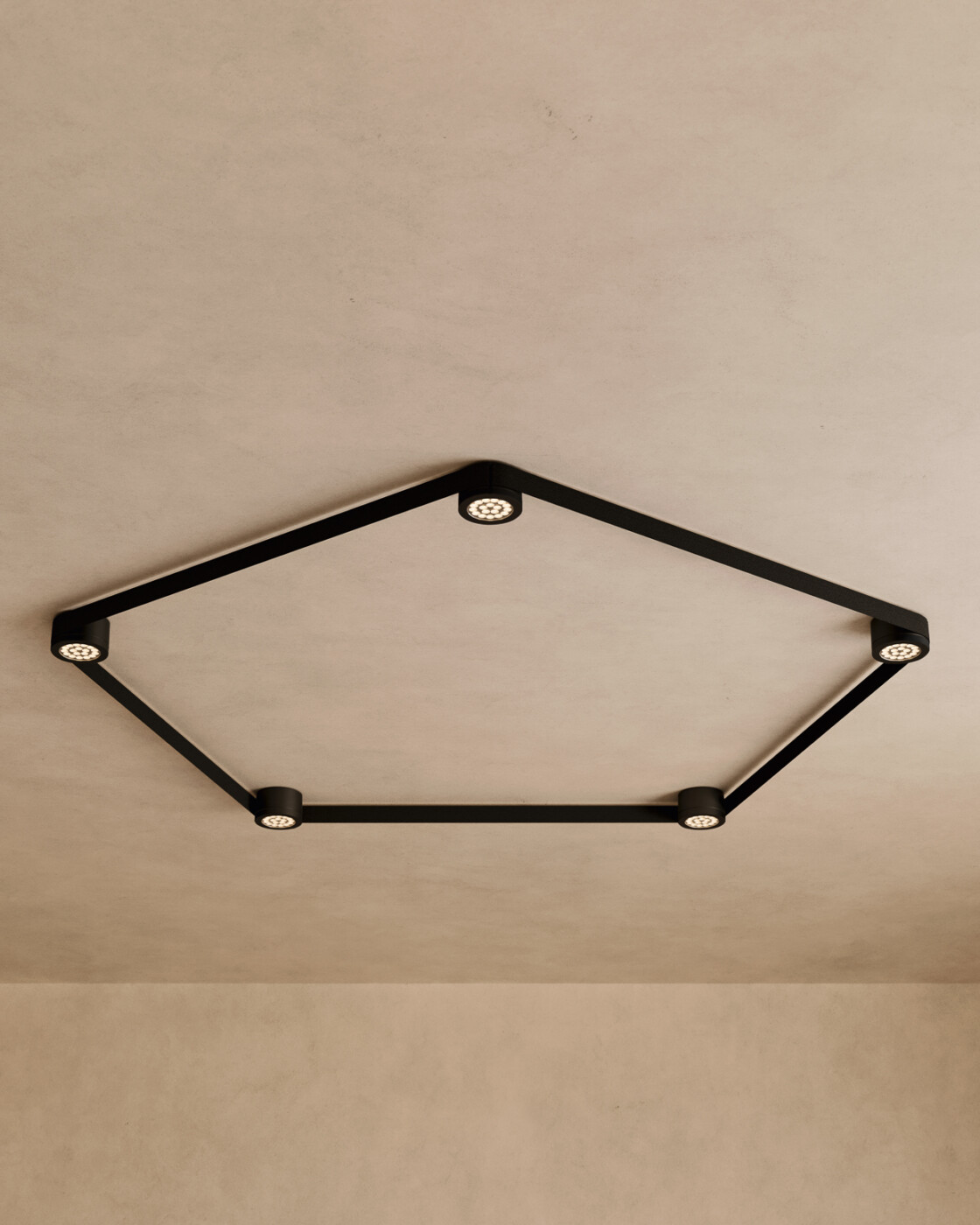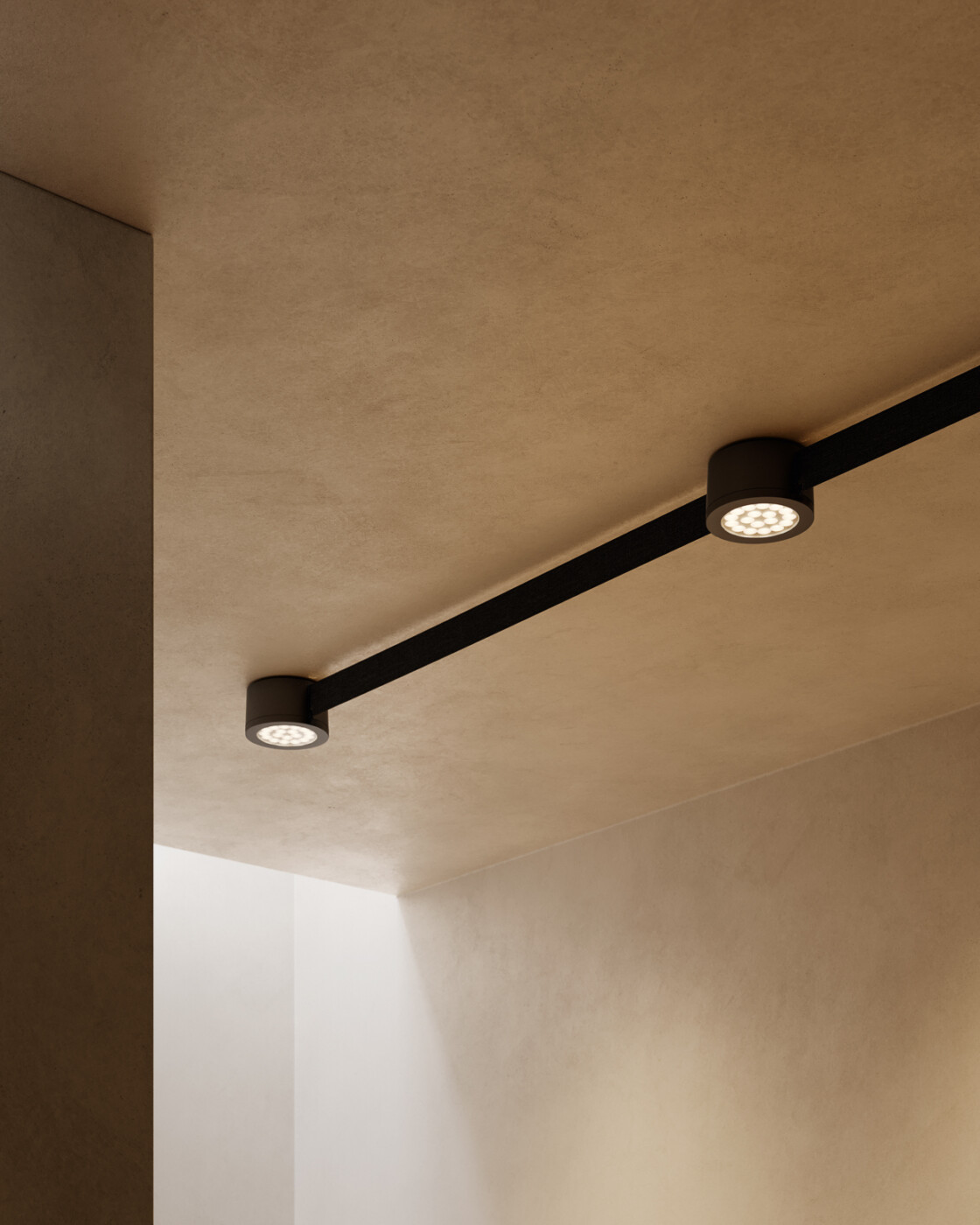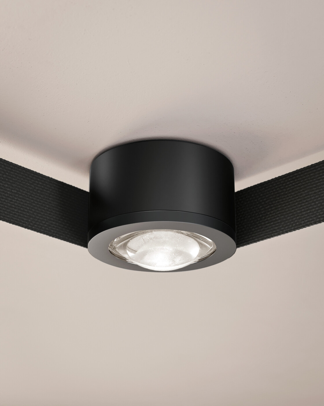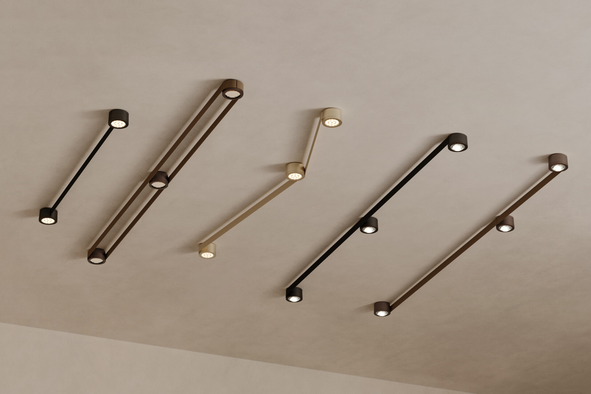 The Map lamp uses the tactility of a textile belt in a pioneering lighting concept. Much like drawing points and connections on a map, the conductive belt allows for free placement of the dot-shaped luminaires, creating unique graphic constellations. The light fixtures serve as fixed anchor points, while the textile belts flexibly and elegantly wrap around them, creating a web of intriguing tension. As the transformer is built into the starter lamp, no canopy is required. From this point, the plotting of the constellation unfolds, seamlessly concealing the power supply’s origin. From simple double-fixture setups to complex configurations with dozens of fixtures extending from walls to ceilings, Map effortlessly adapts to a wide range of environments. A selection of add-ons such as reflectors and diffusors complement the collection.