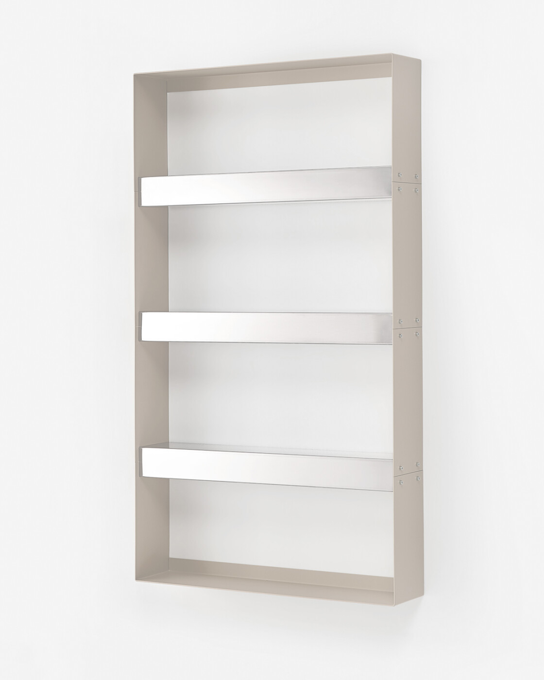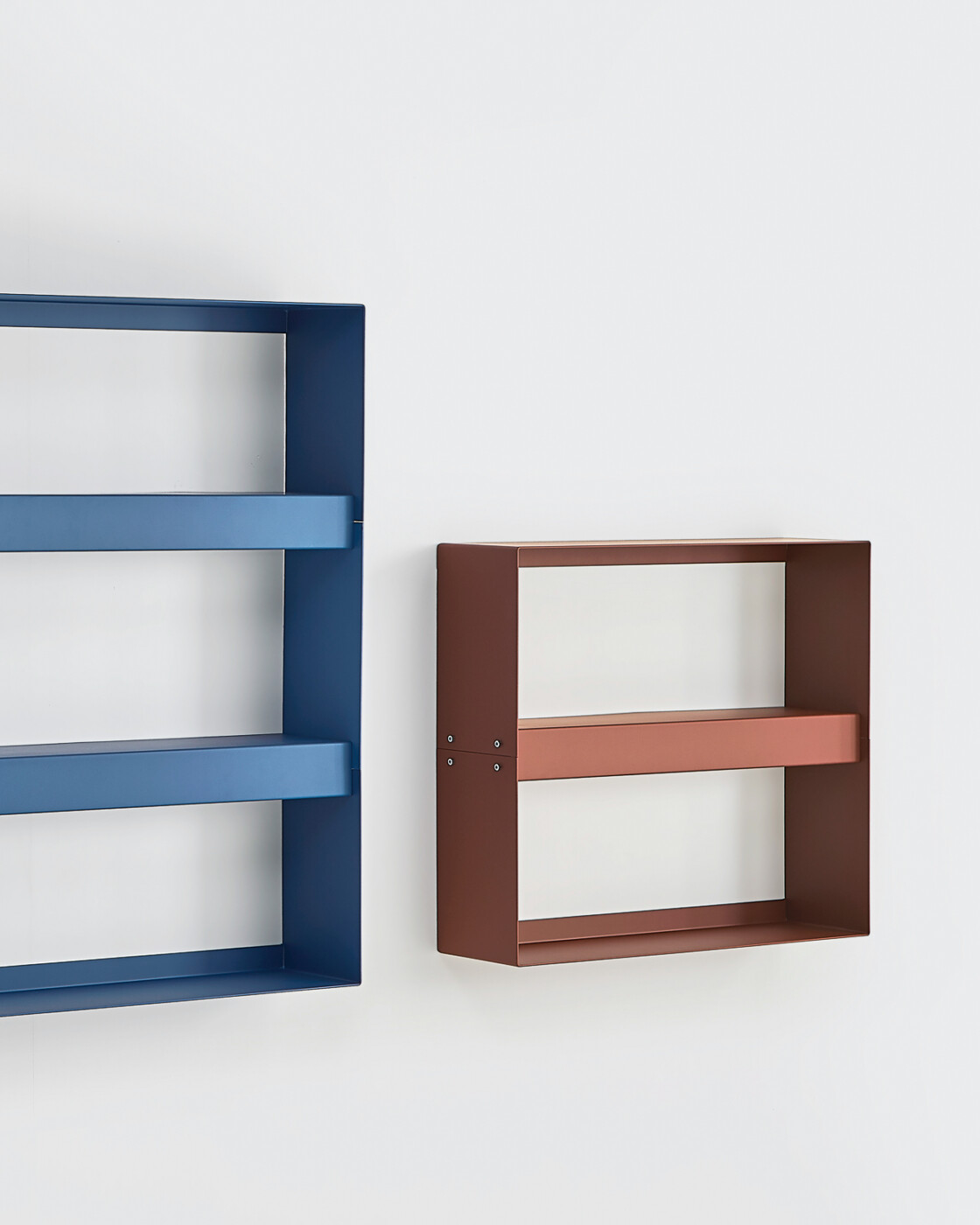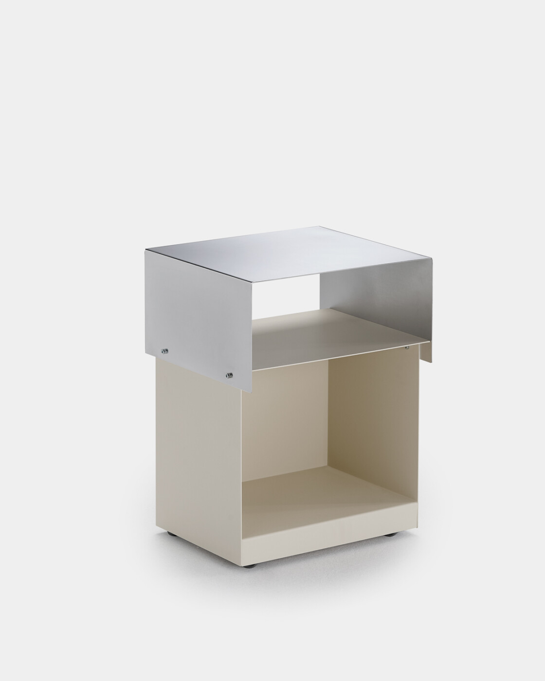 Seta trolley is crafted to serve a multitude of purposes – whether as a bedside table, a sofa accent table, a bathroom storage unit, or an office trolley – this little sidekick seamlessly integrates into any environment. Designed for flexibility, it features discreet wheels that help to effortlessly manoeuvre between different spaces or simply showcase its elegant back by turning it around. Following the trolley’s debut, the collection was expanded with matching wall-mounted shelves that echo its play on solid volumes framed by slender steel sheets.