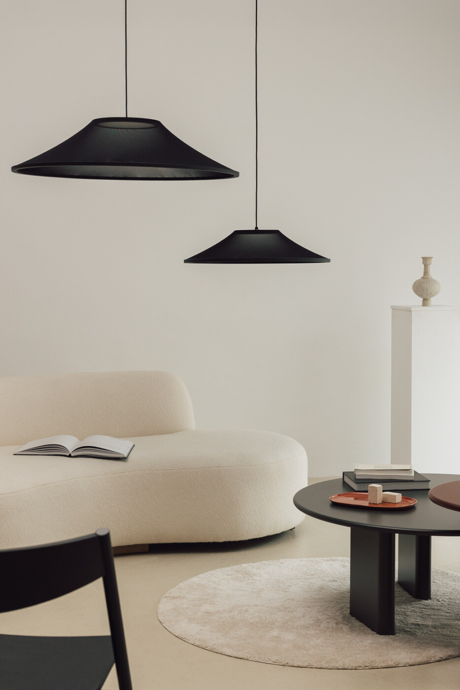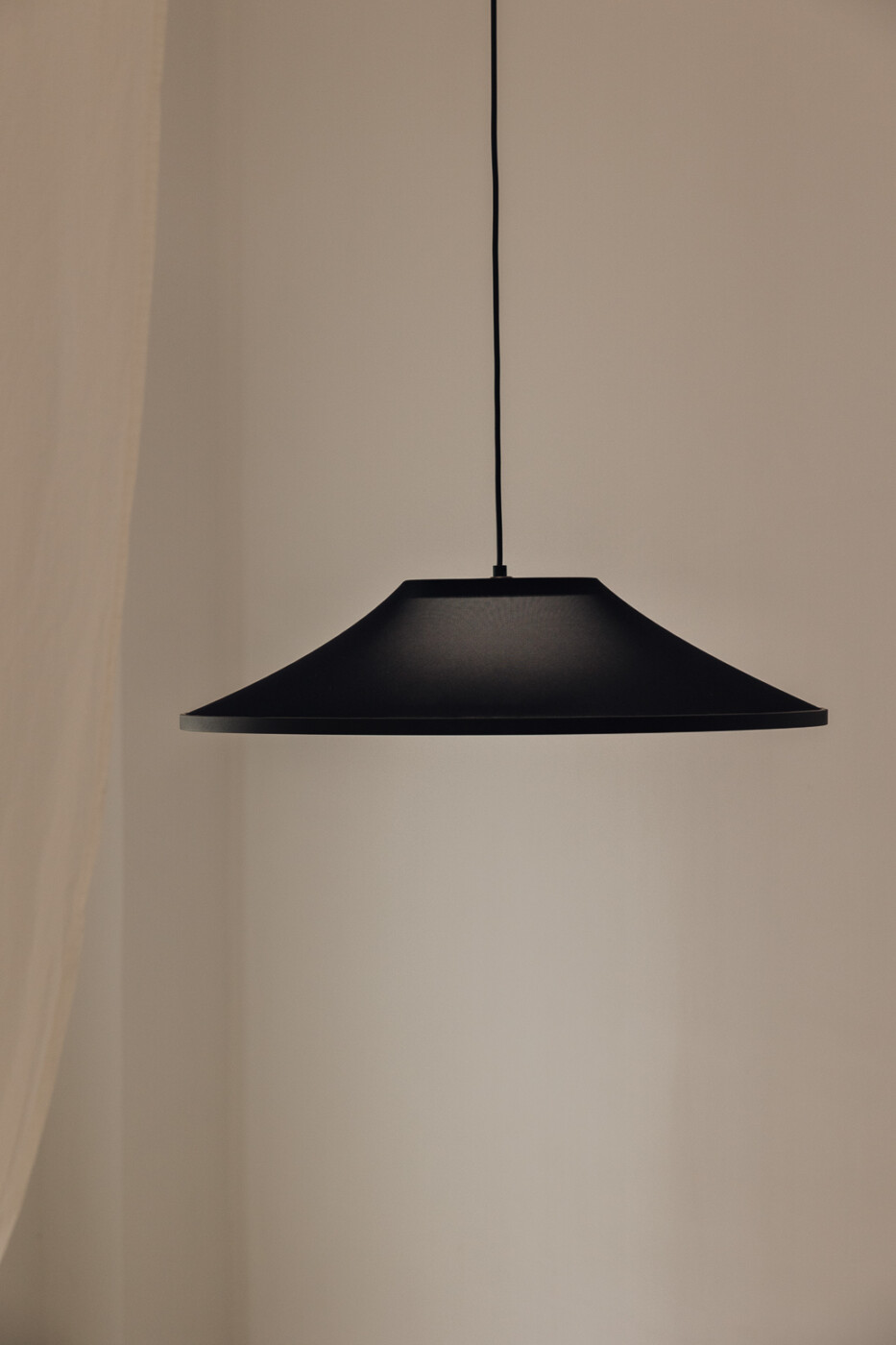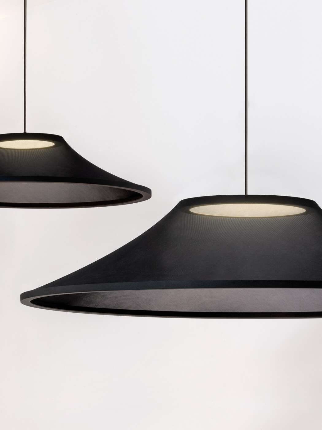 The Warp pendant lamp refines the familiar conical lampshade into a pure and essential form. The way its transparency filters the light and the tactile richness of the textile provide subtle features that are only revealed upon closer inspection. The shade is made from a flexible fabric that only takes shape when suspended. Gravity naturally pulls on the outer brim, forming a fluid, trumpet-like silhouette, rounded off by rather edgy ends. A very flat LED light source eliminates the need for a visible bulb, enhancing the lamp’s aesthetic by allowing the stretched textile to take centre stage. This design allows for flat-pack shipping, while its instant transformation upon hanging ensures effortless installation.
