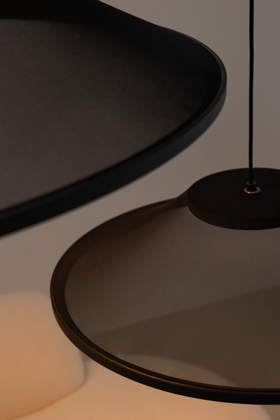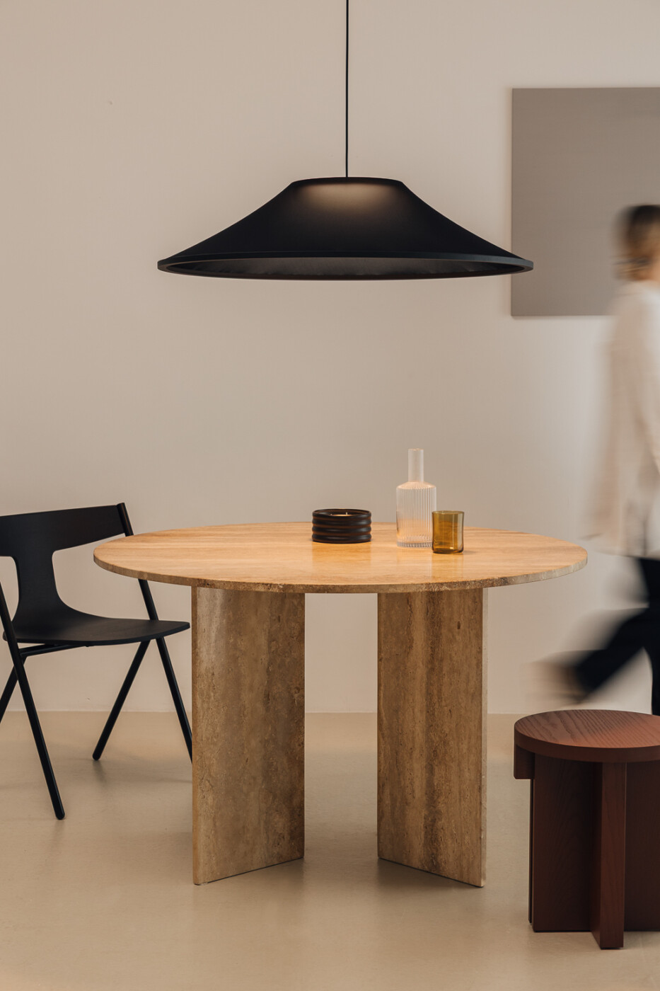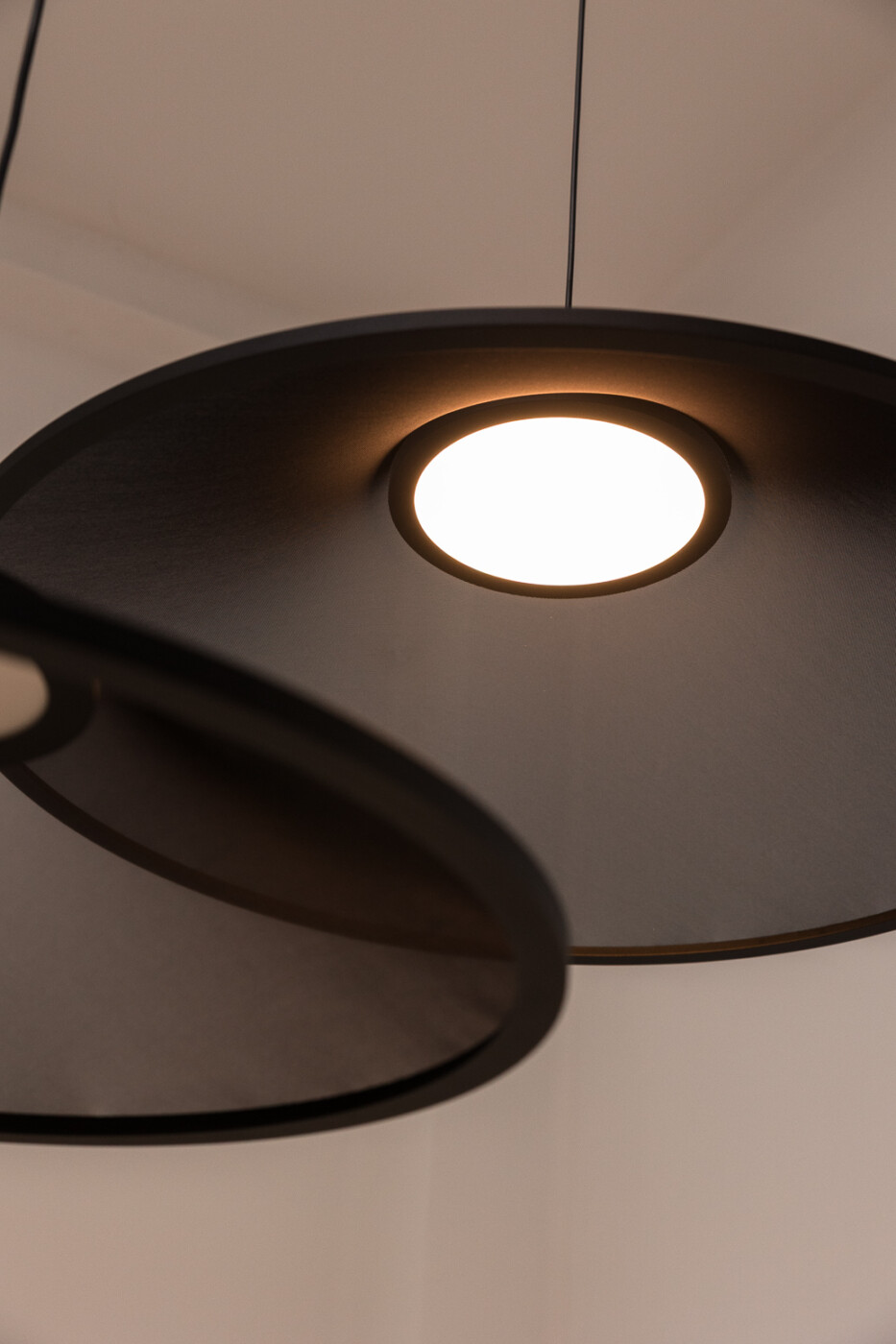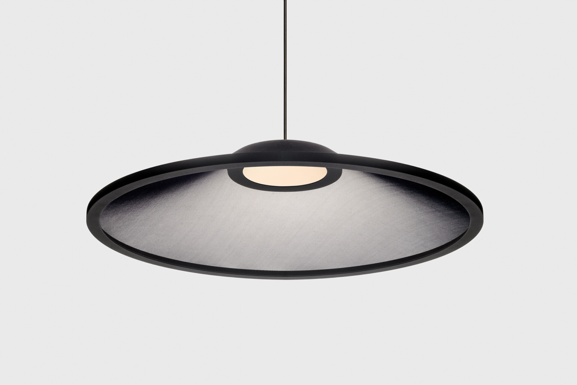 The Warp pendant lamp refines the familiar conical lampshade into a pure and essential form. The way its transparency filters the light and the tactile richness of the textile provide subtle features that are only revealed upon closer inspection. The shade is made from a flexible fabric that only takes shape when suspended. Gravity naturally pulls on the outer brim, forming a fluid, trumpet-like silhouette, rounded off by rather edgy ends. A very flat LED light source eliminates the need for a visible bulb, enhancing the lamp’s aesthetic by allowing the stretched textile to take centre stage. This design allows for flat-pack shipping, while its instant transformation upon hanging ensures effortless installation.